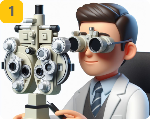 Diawali dengan pemeriksaan (refreaksi mata) bertujuan untuk menentukan ketajaman pengelihatan dengan menggunakan berbagai jenis lensa